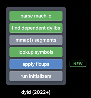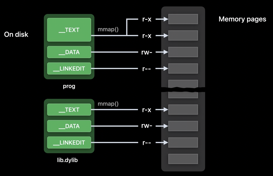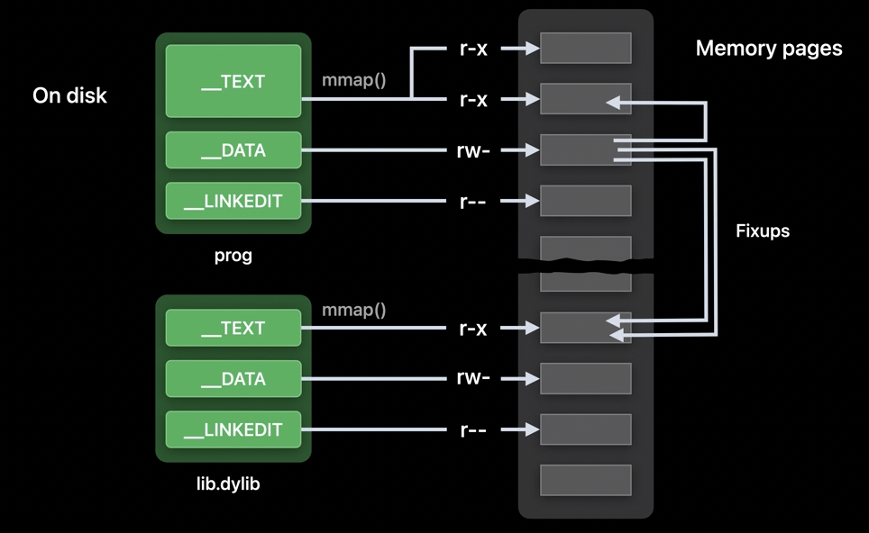 - 'page-in linking'에서는 데이터 페이지가 메모리로 로드될 때 커널이 페이지에 필요한 수정을 적용합니다. 이것은 이전에는 dyld가 수행했던 작업을 커널이 대신하는 것을 의미하며, 메모리 사용을 최적화하고 실행 시간을 단축시키는 데 기여합니다. (동적 링커는 앱 최초 실행시에 동작하기 때문에 이 작업을 수행할 수 없습니다.)