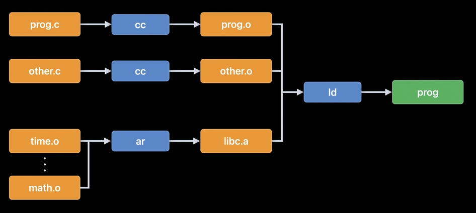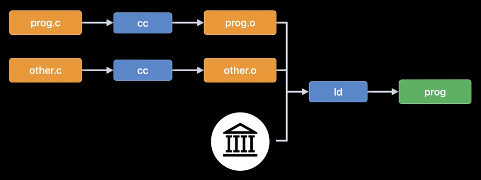 그래서 오브젝트 파일(prog.o, other.o)과 정적 링커(ld)가 등장했습니다. 오브젝트 파일은 최종적인 실행파일이 되기 전 중간단계의 바이너리 파일이라고 생각하시면 됩니다. 정적 링커는 소스코드를 컴파일하는 컴파일러(cc)와 별개로 오브젝트 파일을 모아 최종적인 실행가능 프로그램을 만들어내는 역할을 합니다. 이렇게되면 이전과 다르게 각 소스파일의 기능을 잘 구분해놓으면 매번 모든 코드를 컴파일할 필요가 없게됩니다. 수정사항이 없는 영역일 경우 오브젝트 파일을 재사용할 수 있기 때문입니다.