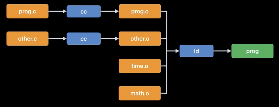 1970년대, 초기에는 컴파일에 복잡한 처리가 필요없었습니다. 하나의 소스파일(prog.c)에서 컴파일러(cc)를 실행하면 최종적으로 실행가능한 프로그램을 생성해냈습니다. 이는 심플한 과정이지만 이렇게되면 기능이 늘어날수록 소스파일(prog.c)이 방대해진다는 단점이 있었습니다. 그 방대한 소스파일로 인해 사소한 기능 하나하나가 수정될 때에도 모든 코드를 컴파일해야만 했습니다.