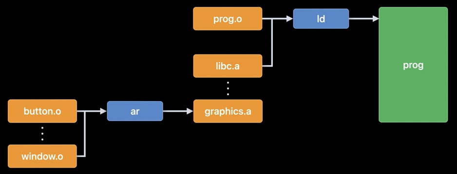 이렇게 변화함에 따라 사람들은 오브젝트 파일을 주고받으며 서로의 프로그램에 좀 더 쉽게 영향을 줄 수 있게 되었습니다. 하지만 오브젝트 파일 여러개를 매번 공유하는 것도 번거롭다고 생각한 누군가가 이들을 하나로 묶으면 좋지 않을까 생각합니다.