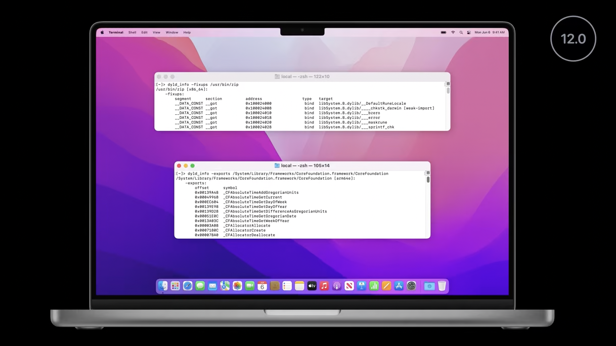 - 실행 파일이나 동적 라이브러리의 LINKEDIT 세그먼트에는 심볼의 이름과 그에 대한 다양한 정보가 저장됩니다. 동적 링커(dyld)는 실행 시 이 정보를 참조하여 심볼의 실제 메모리 주소를 찾아냅니다. 예를 들어 'libSystem.dylib'에 정의된 '_malloc' 심볼의 실제 메모리 주소를 찾아내는 방식입니다.