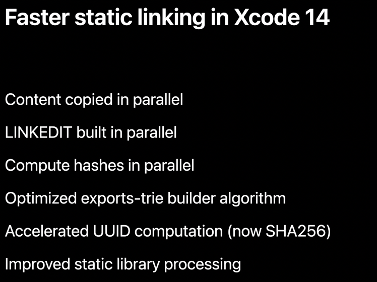 정적 링킹 속도를 평균 2배이상 빠르게 만들었다고 합니다. 여러가지 작업을 병렬적으로 수행하고 알고리즘을 개선했으며, 바이너리의 UUID를 계산할 때 하드웨어 가속을 지원하는 최신 암호화 라이브러리(SHA256)를 사용했다고 하네요. (cf. 하드웨어 가속? 특정 연산을 CPU가 아닌, 그 연산을 특화하여 처리할 수 있는 전용 하드웨어(예: GPU, DSP, TPU 등)를 사용하여 수행하는 기술)