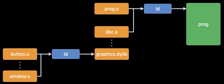 아카이브 도구(ar) 대신 링커(ld)를 사용해 최종 라이브러리가 실행가능한 바이너리 형태(graphics.dylib)가 됩니다. 이것이 90년대에 대두된 동적 라이브러리의 시작이었습니다.