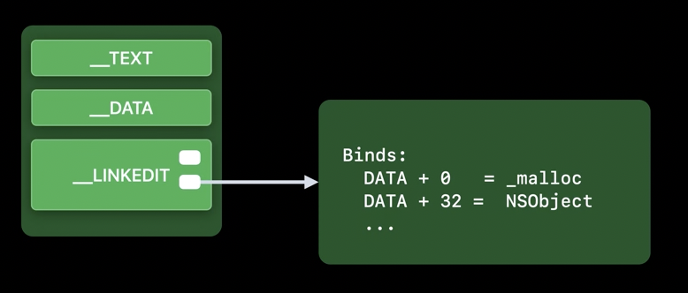 - dyld는 LINKEDIT 세그먼트의 정보를 참조하여, 각 내부 포인터가 현재의 실제 메모리 위치를 올바르게 가리키도록 조정합니다. 이는 프로그램이나 라이브러리의 각 부분이 서로 올바르게 '연결'되어 작동하도록 보장합니다.