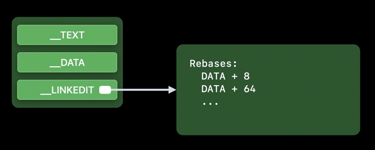 - 실행 파일이나 dylib의 LINKEDIT 세그먼트에는 리베이스 작업에 필요한 정보가 저장됩니다. 이는 포인터들이 원래 가리키려고 했던 대상 주소(예를 들어, dylib가 메모리 주소 0에서 시작한다고 가정했을 때의 주소)를 포함합니다.