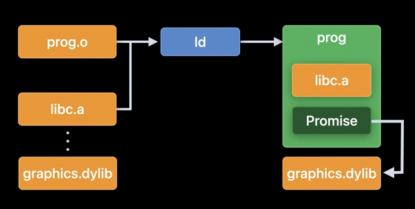 또한 빌드 시 실행 파일에 기록되는 약속(Promise)을 이행할 수 있는 동적 링커가 필요해집니다. 실행 가능한 바이너리는 여러 세그먼트로 분리되는데, 최소한 TEXT, DATA, LINKEDIT 세그먼트로 분리됩니다. 각각의 세그먼트는 다른 기능을 가집니다.